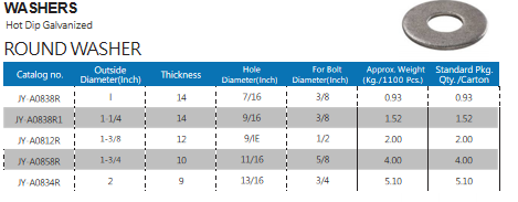 Round Washer is a hot-dip galvanized steel load-distribution fastener for power infrastructure, specially designed to be paired with bolts/screws in utility pole mounting. With an outside diameter ranging from 1" to 9", it fits 3/8"–3/4" bolts, weighs 0.93–5.10kg/100pcs, and is packaged 3–510 pcs/carton (corrected from original typo). Engineered to distribute fastener load evenly and prevent indentation on utility pole and hardware surfaces.