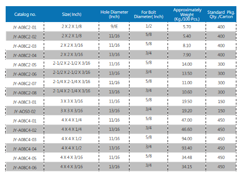 Square Washer (JY-A08C2 series) is a hot-dip galvanized steel load-distribution fastener for utility pole and power infrastructure, paired with double arming bolts to lock crossarms/poles via nuts. Available in sizes 2×2"–4×4" (with 1/8"–3/16" thickness variations), hole diameters 9/16"–13/16" (fitting 1/2"–3/4" bolts), weights 4.00–3415.00kg/100pcs, packaged 300–450 pcs/carton. Its square design provides a large contact area to prevent wood splitting and distribute bolt load evenly on utility poles.